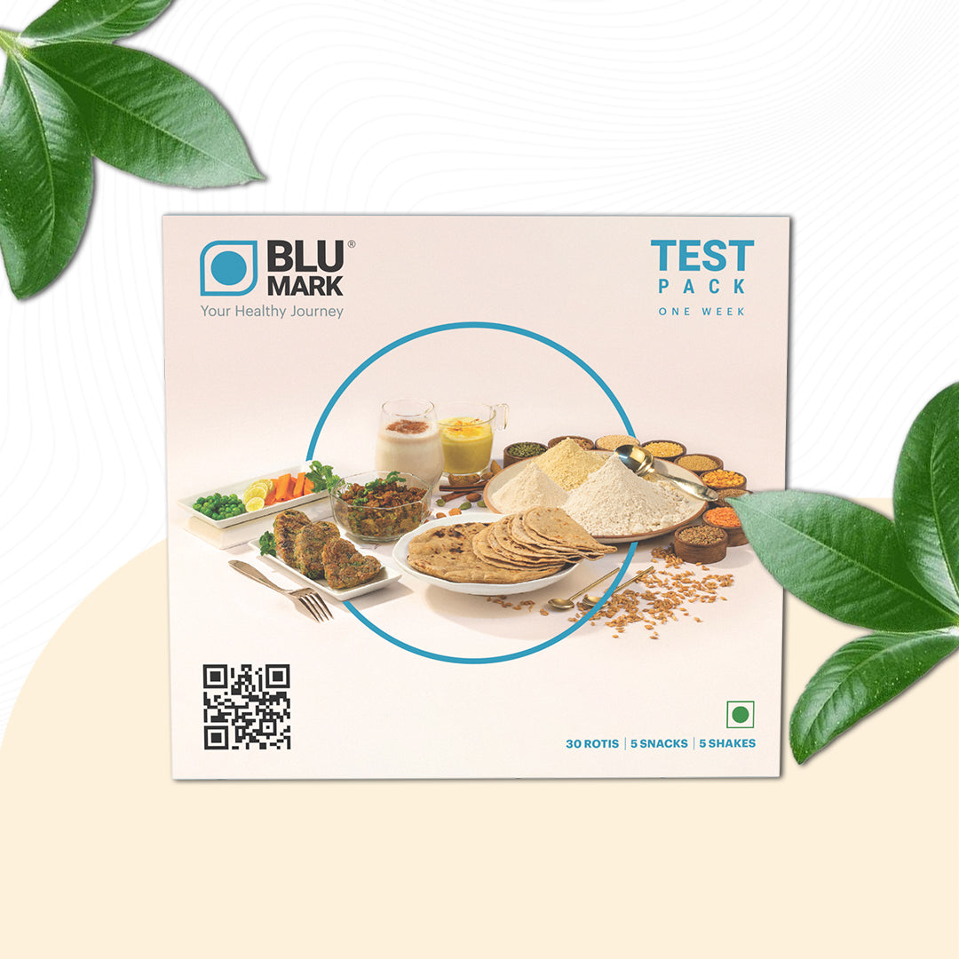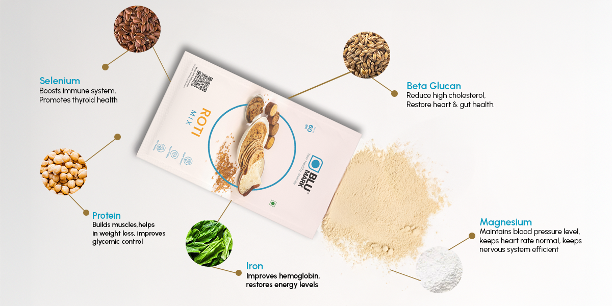 30 G.I. BluMark Flour( (Whole Grain) barley, buck wheat, millets (kodo, foxtail, proso, barnyard), soy.) Whole wheat flour, Jaggery & Dates Powder, Milk Solids, Bakery Shortening, Leavening Agents[custard powder-INS500(ii)(<0.83%), baking powder-INS500(iii) (<0.12%) ] & salt (<0.083%), Trans Fats < 0.5%